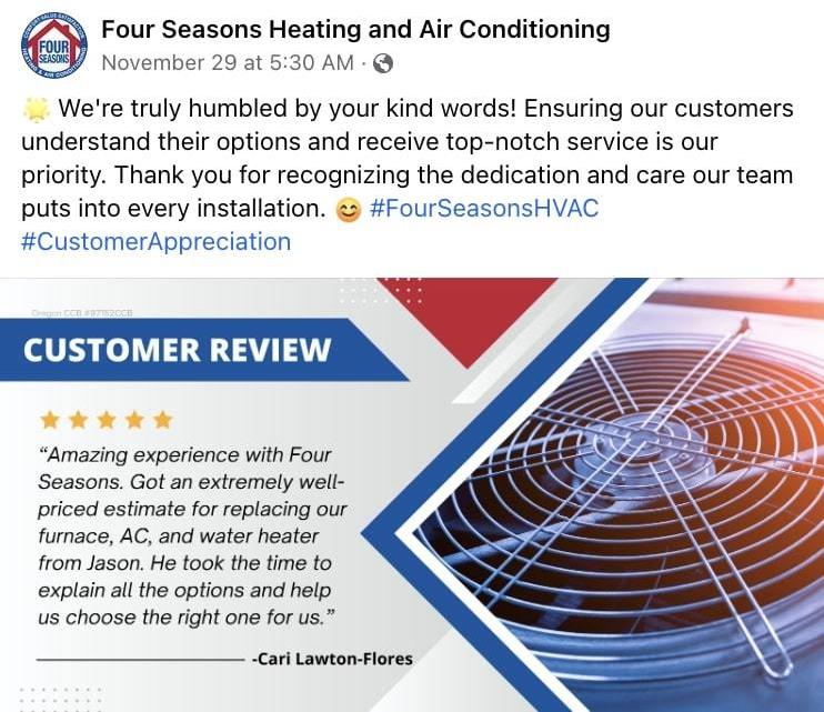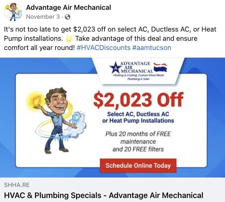 Limited-time offers give potential customers a reason to contact you immediately rather than waiting. As part of your HVAC marketing campaign, consider posting flash promotions or discount offers on Facebook, Instagram, and other accounts.