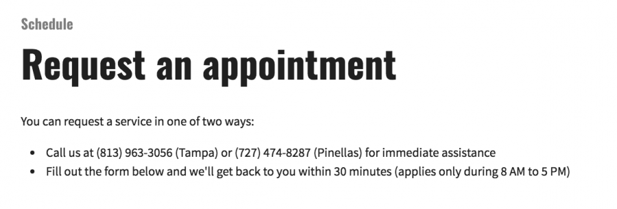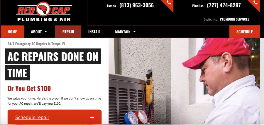 Make sure people know how and when they can get a hold of you. It should be crystal clear from your website’s navigation. For example, Red Cap’s website calls attention to their phone numbers and schedule buttons by making them red, which contrasts with the black and white backgrounds.