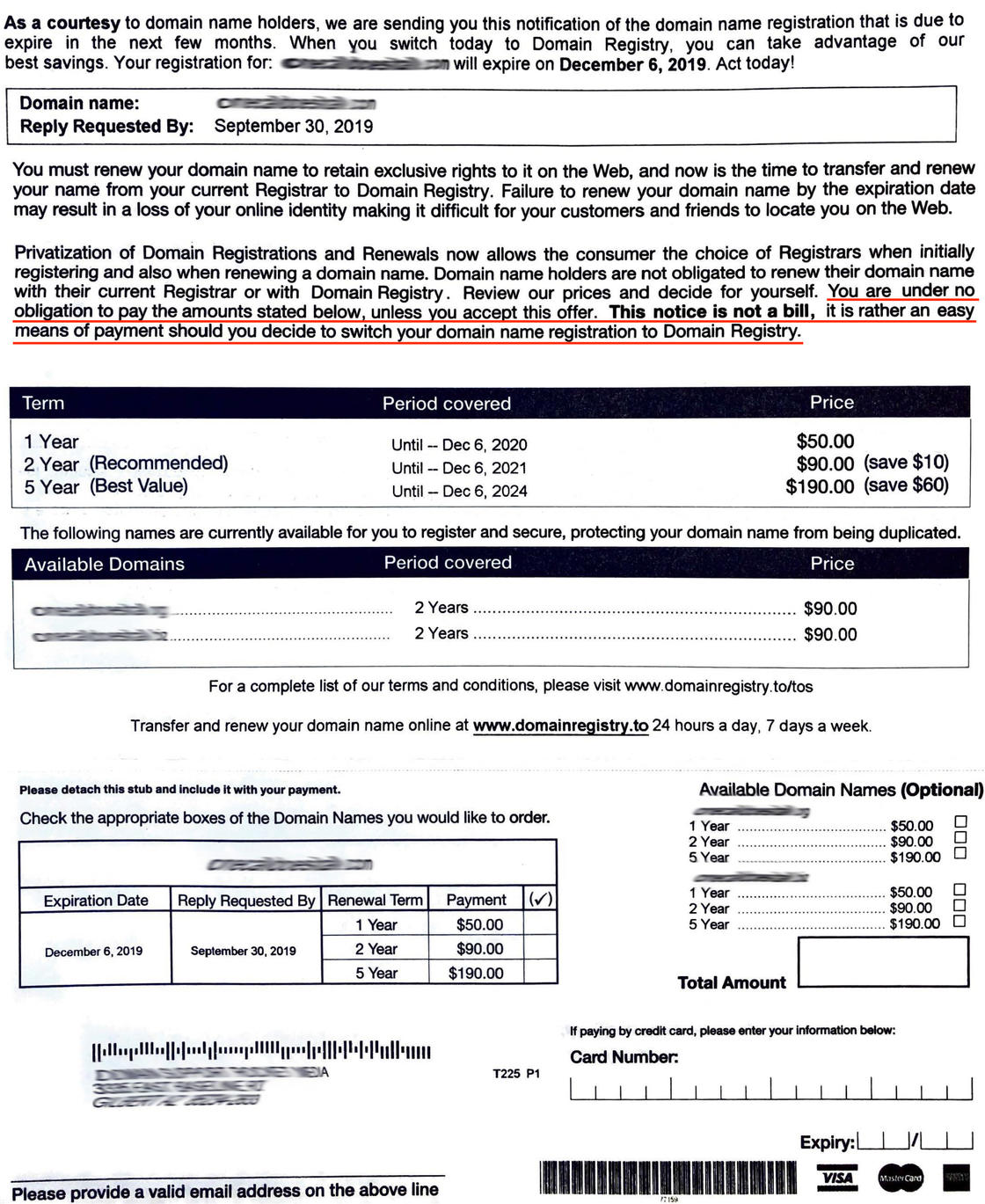 "You are under no obligation to pay the amounts stated below, unless you accept this offer. This notice is not a bill, it is rather an easy means of payment should you decide to switch your domain name registration to Domain Registry."