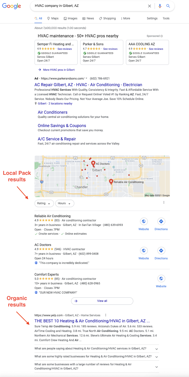 For example, here at Rocket Media HQ in Gilbert, AZ, I typed in a Google search for “HVAC company in Gilbert.”