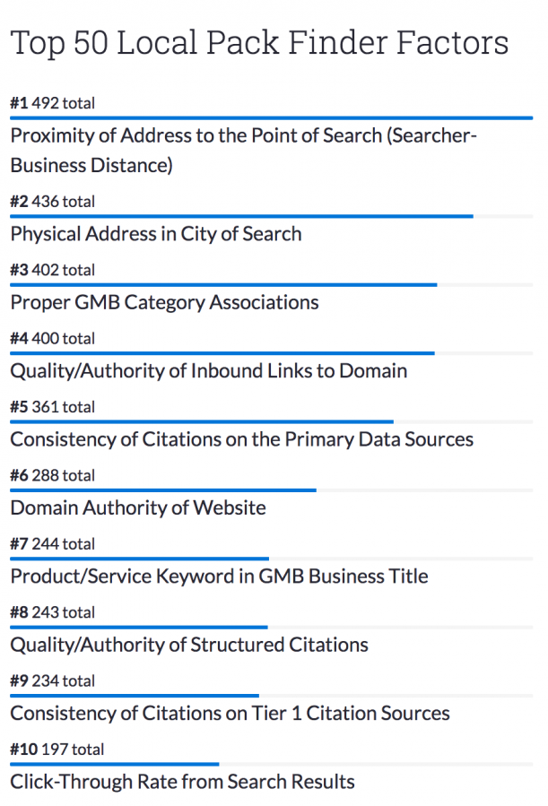 As you can see, while proximity to the searcher is the #1 factor that affects local Google pack rankings, there are still 9 more major factors (49 total on the full list) that affect a company’s ranking.