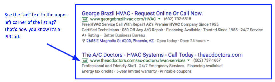 PPC ads are the search results you see first listed in Google results. They’re a great way to generate leads quickly.
