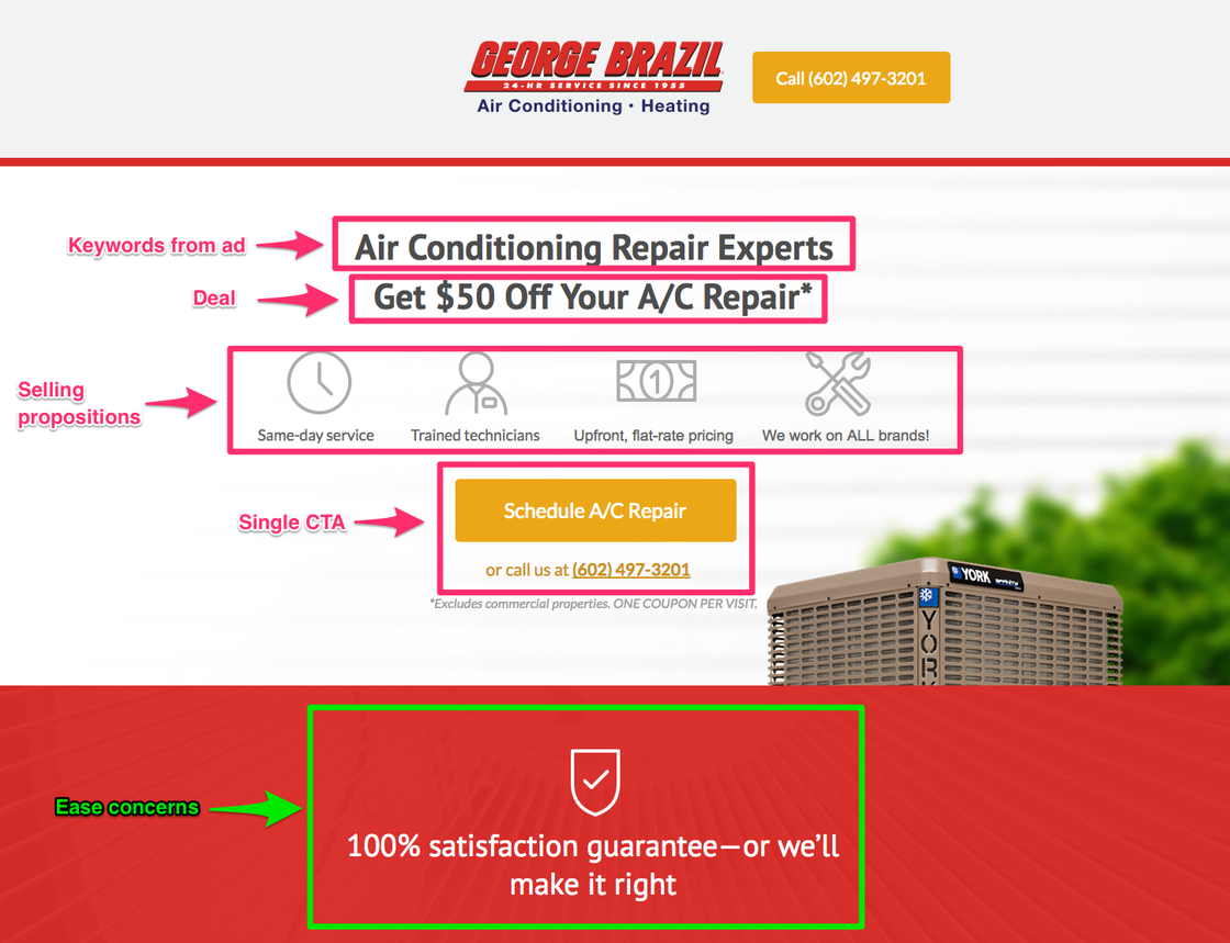 - Matches content to the search term. If your landing page content doesn’t match the PPC ad your lead clicked on, they’ll lose interest and won’t stay on the page very long. For example, if your ad says “AC repair in Phoenix”, your landing page needs to match those keywords.