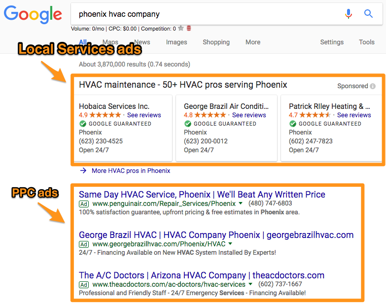 You also pay for prime real estate on the search engine results pages (SERPs), appearing just below the Local Services ads (another way home services companies can get to the top of SERPs):