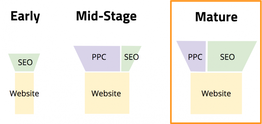 To get the most from your efforts, use PPC and SEO together. As our graphic below shows, a mature website relies mostly on SEO, but also uses PPC.