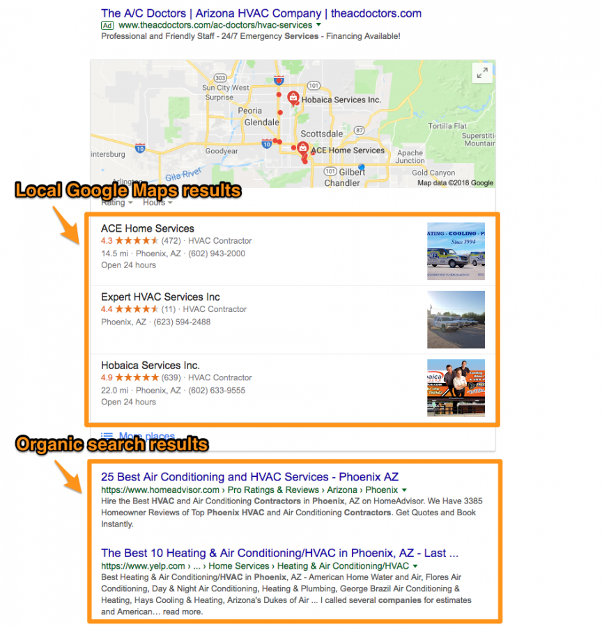 What’s the difference between local results and organic search results? The user’s intent. When a user searches using phrases like “in Phoenix”, Google makes sure to deliver them local businesses.