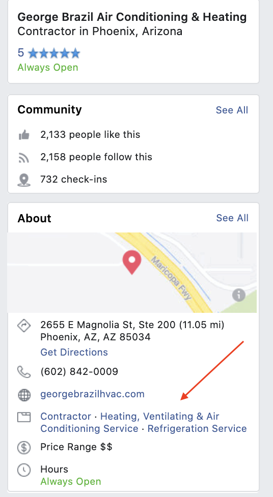 Example of an HVAC company using multiple service categories on their Facebook Business page.